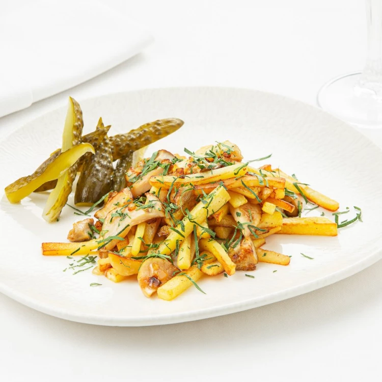Картофель, грибы белые, репчатый лук, масло растительное, соленый огурец