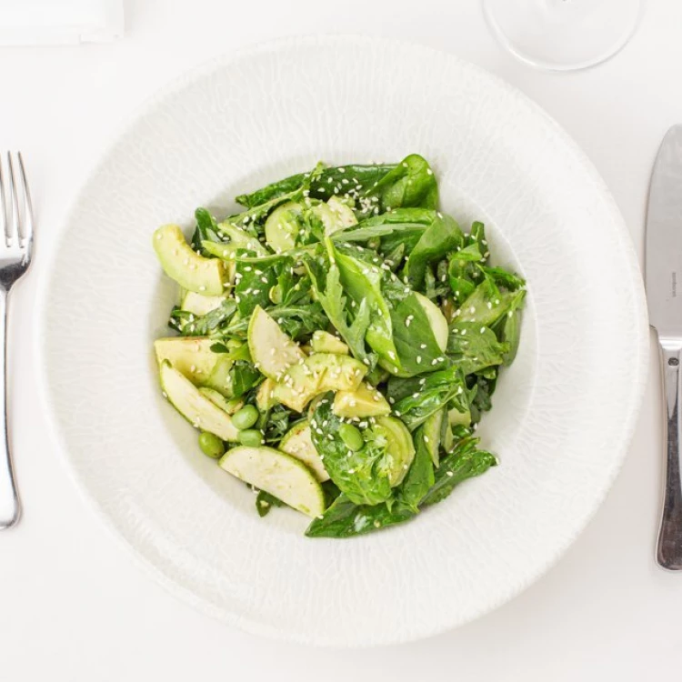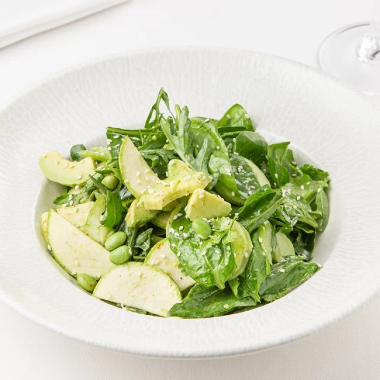 Бобы эдамаме, авокадо, кабачки, огурцы свежие, руккола, сельдерей, шпинат, масло оливковое, горчица