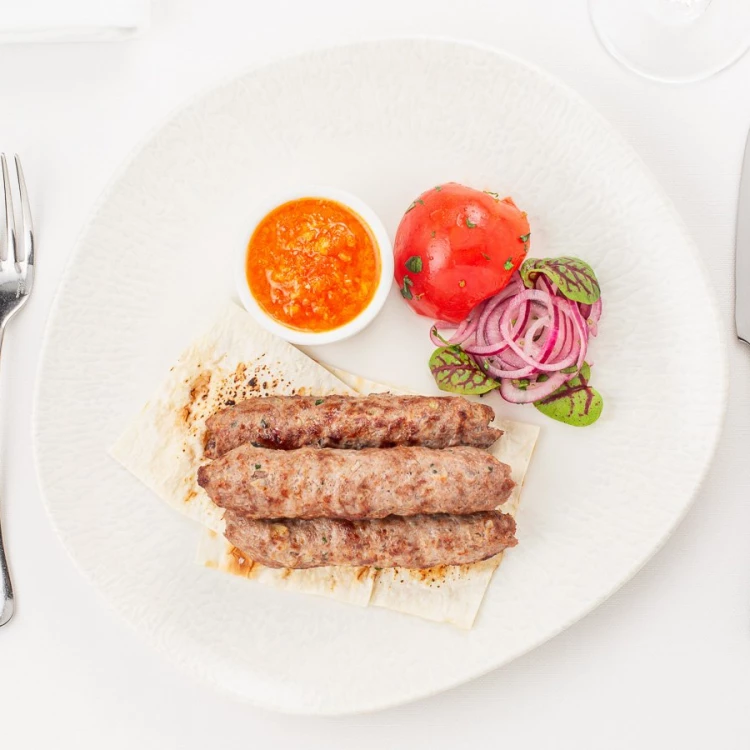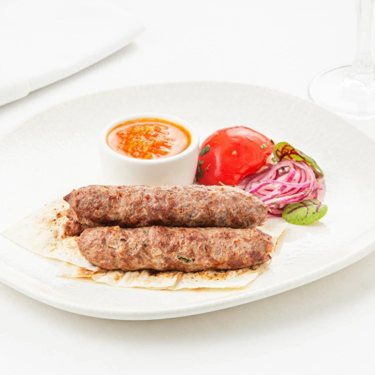 Баранина окорок, лук репчатый, чили, аджика, лук красный, томаты маринованные, лаваш