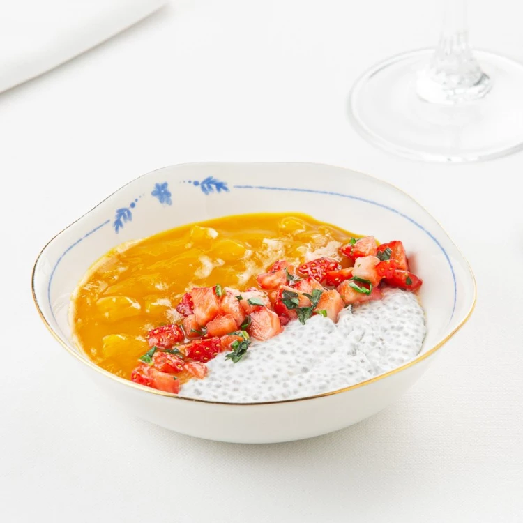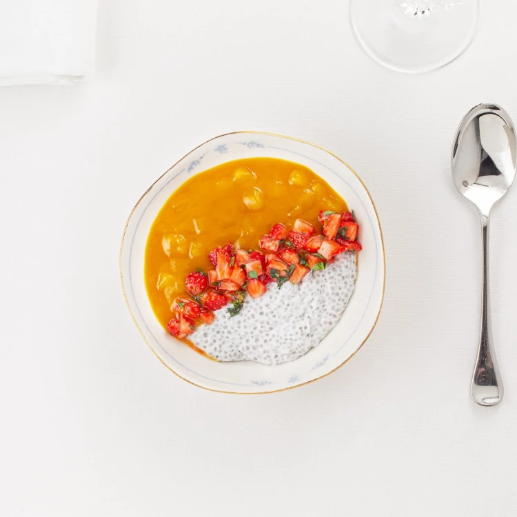 Пудинг из семян чиа на кокосовом молоке с манго и клубникой