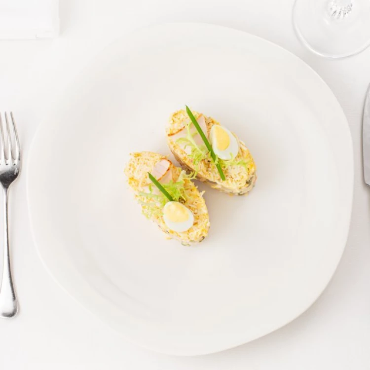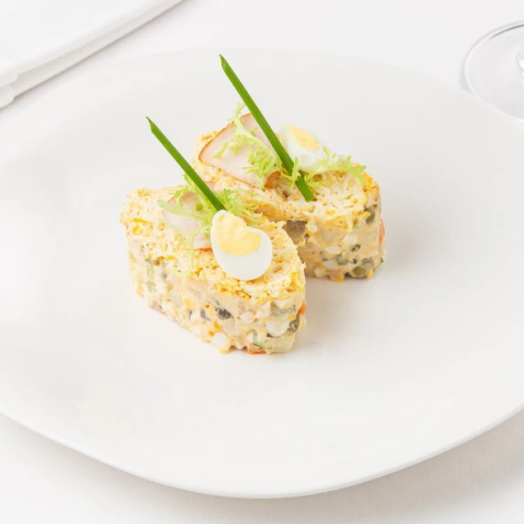 Картофель, морковь, майонез, огурцы соленые, огурцы свежие, горошек консервированный, яйцо, кура отварная, раковые шейки, шнитт-лук