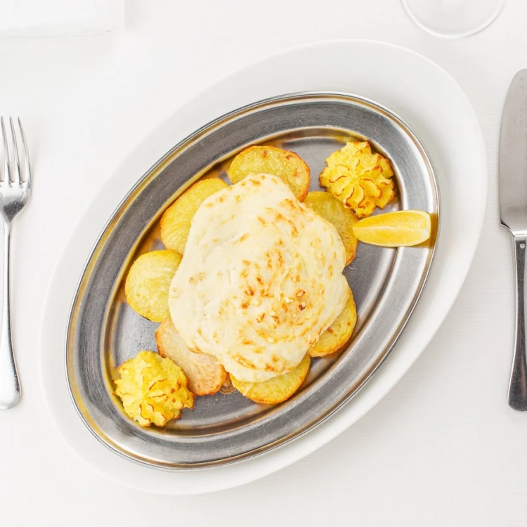 Судак, сметана, картофель, яйцо куриное, шампиньоны, сыр пармезан, лимон