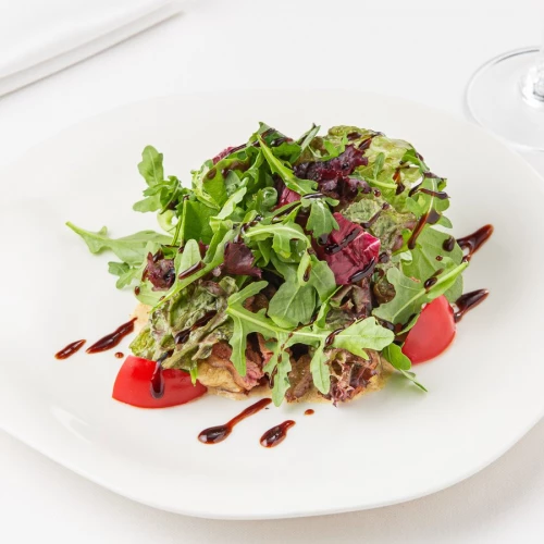 Говядина, грибы белые, соевый соус, сок имбиря, устричный соус, чеснок, сливки, черри, микс салат, руккола, оливковое масло