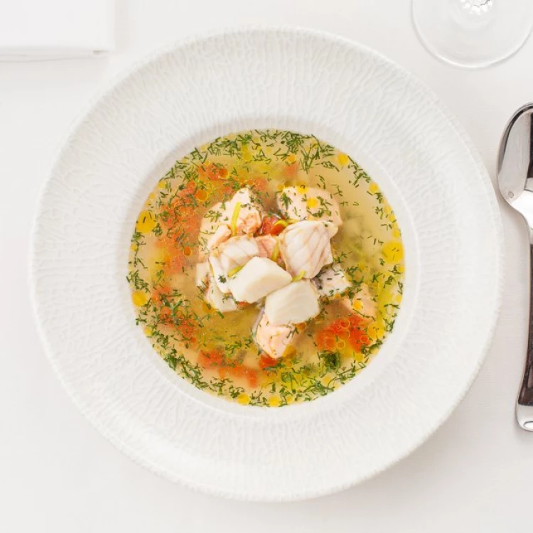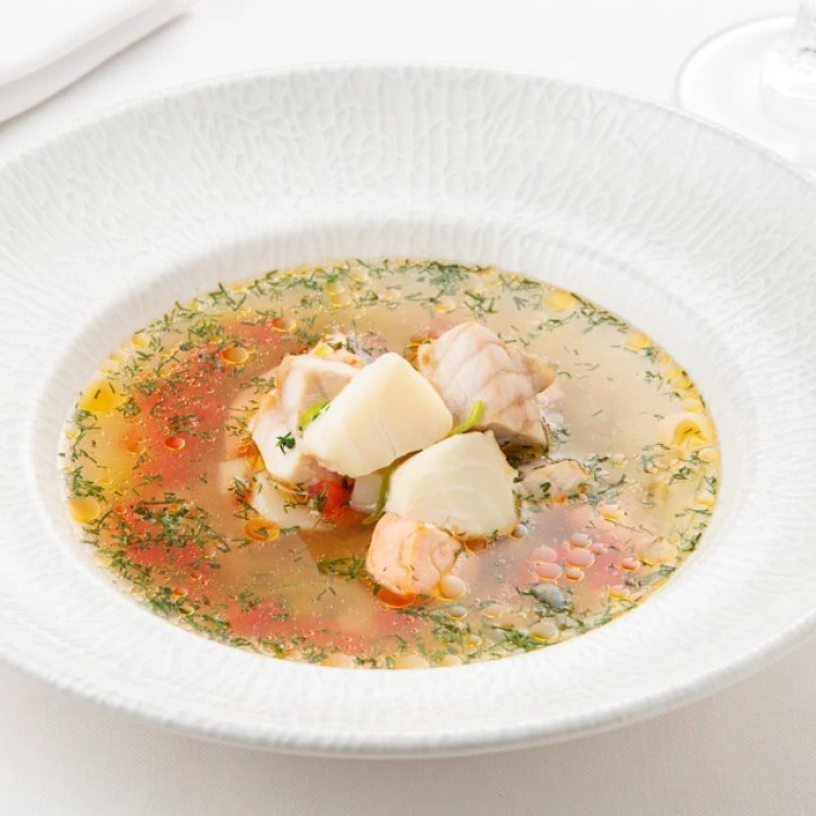 Бульон рыбный, порей, томаты, судак, стерлядь, лосось