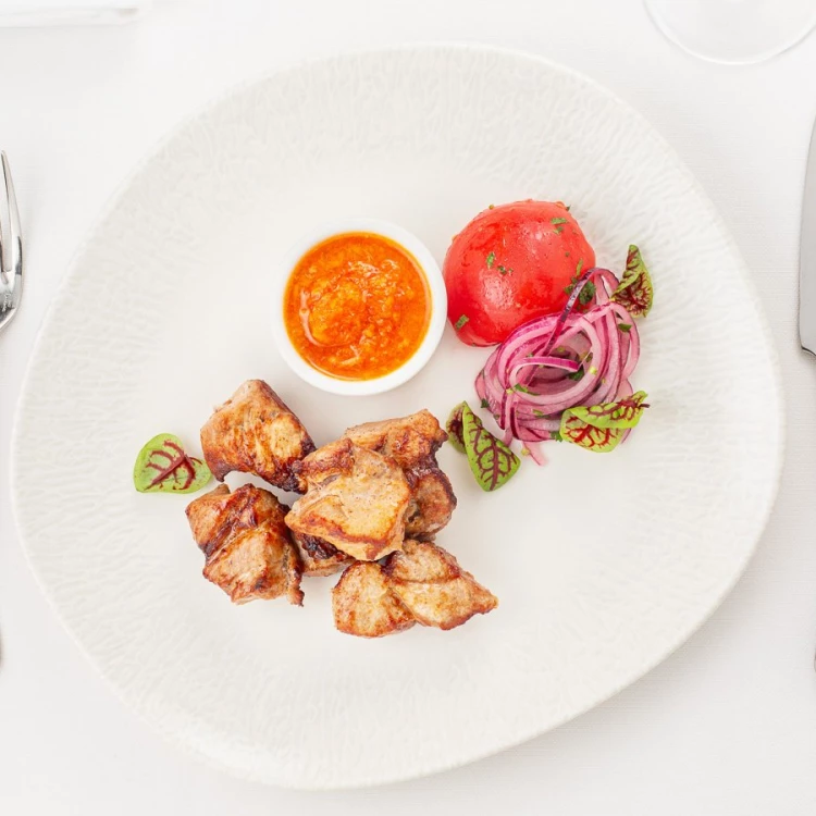 Свинина шея, лук репчатый, масло растительное, аджика, лук красный, помидоры маринованные