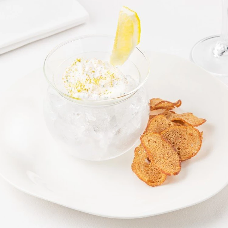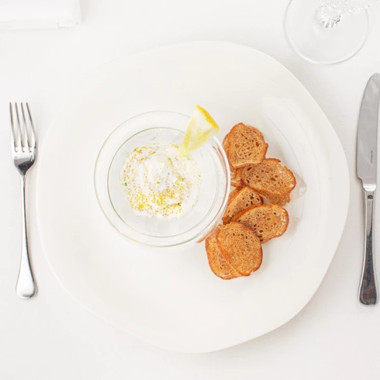 Икра щучья, сливки, шнитт-лук, чипсы хлебные, лимон