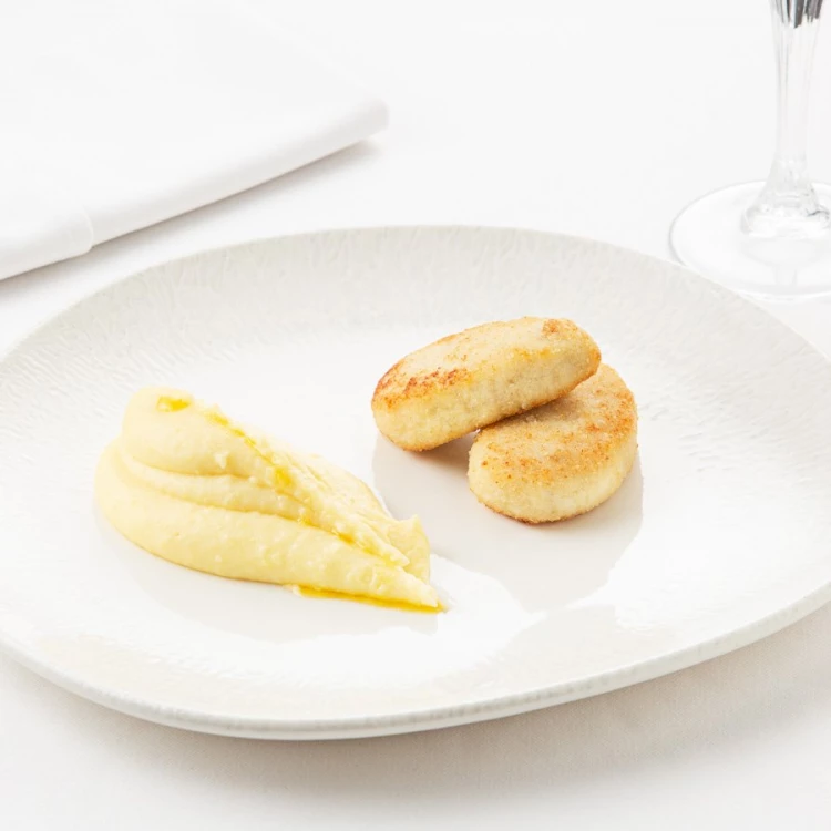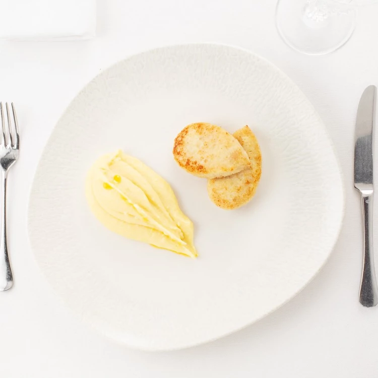 Щука филе, масло сливочное, сливки, сухари панировочные, свёкла, горчица зерновая, лимон, лук репчатый, картофельное пюре.