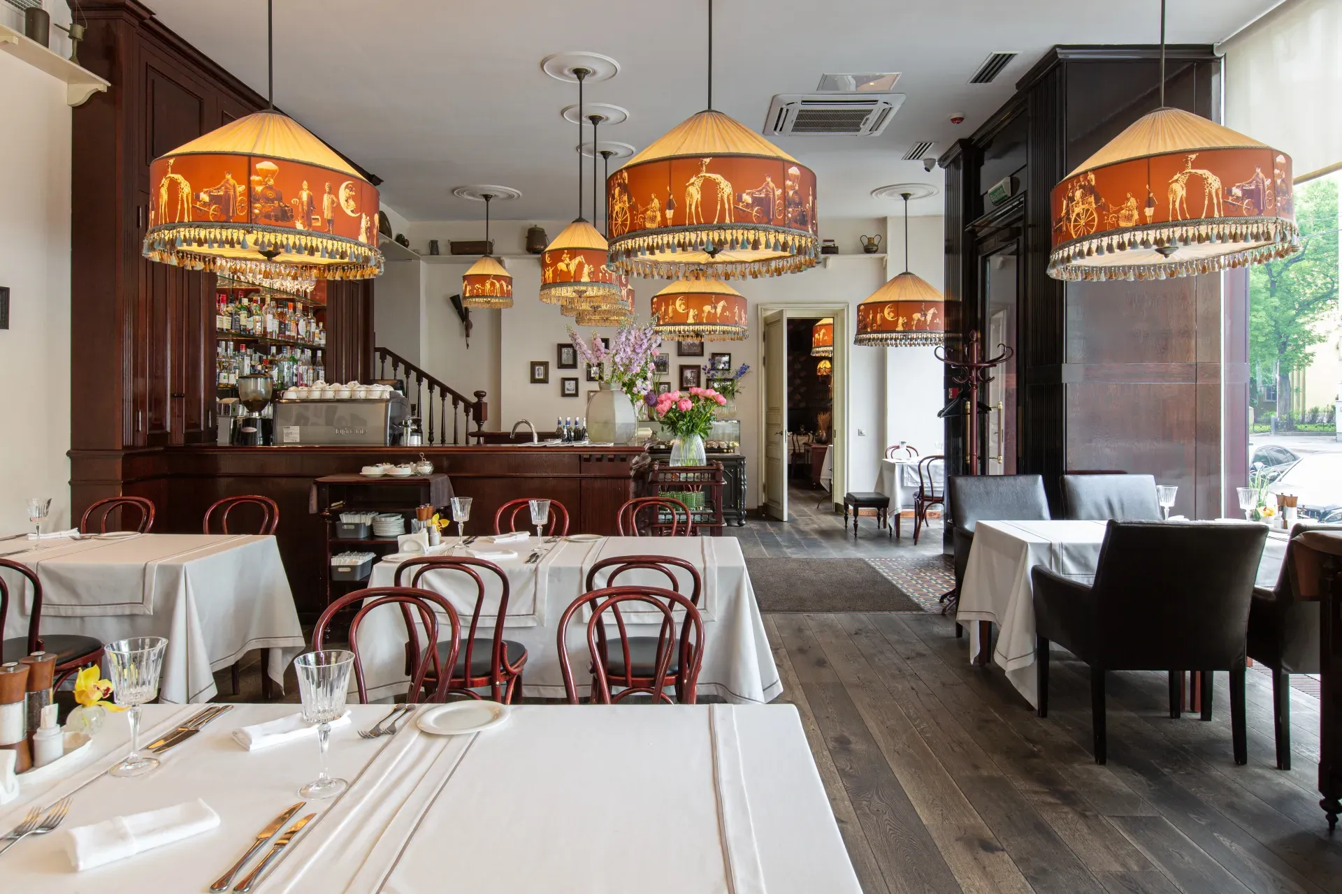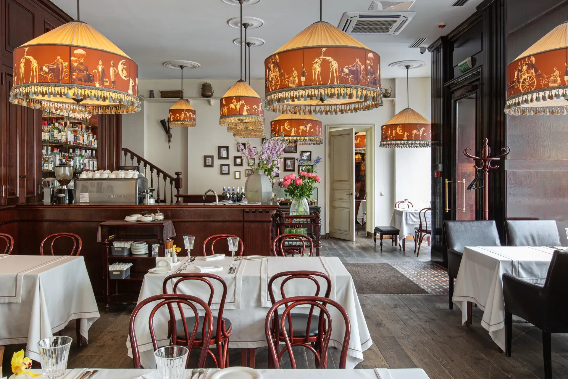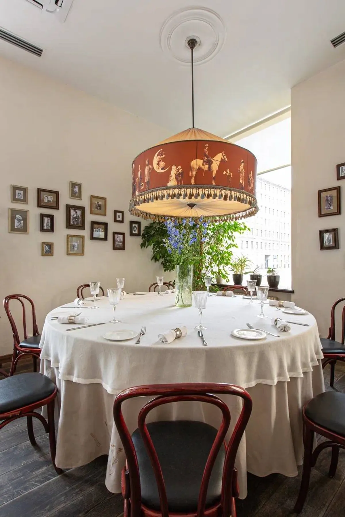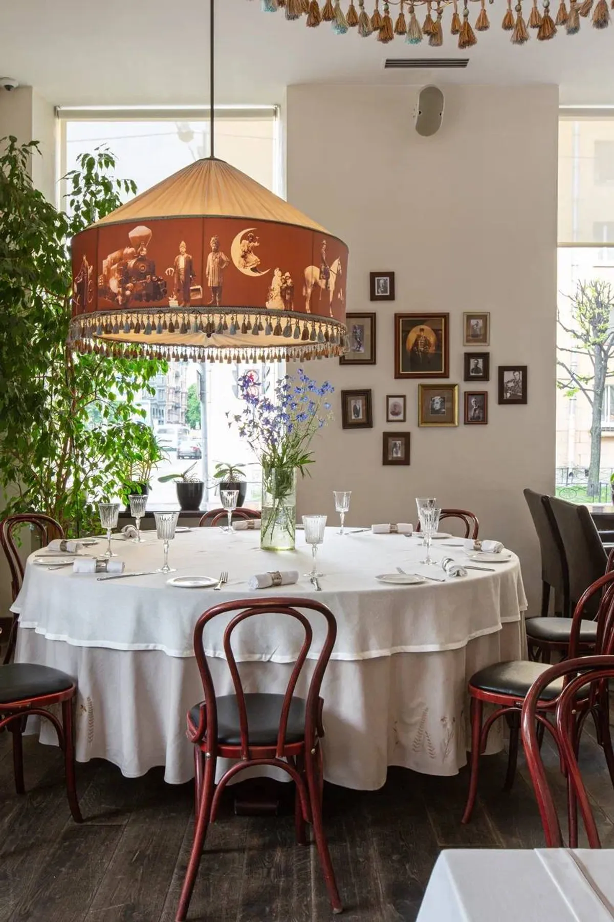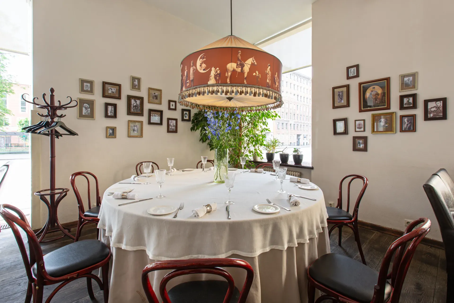 Удобная локация в тихом центре, между Таврическим садом и Смольным. Сдержанный интерьер столичной квартиры начала ХХ века с уютными абажурами, венскими стульями и фотографиями на стенах. Три зала разного размера подойдут как для деловых обедов, дружеских пирушек, так и для семейных застолий. Кухня — русско-европейская, в современной подаче, с предложениями на целый день — от ярких разнообразных завтраков до изысканных ужинов. Утренние каши, йогурты, омлеты и диетические пудинги сменяют дневные супы, пельмени, киевские и щучьи котлеты; вечером — завидное разнообразие блюд для винного застолья или пирушки с более крепкими напитками. В меню найдется даже форшмак и фаршированный карп.